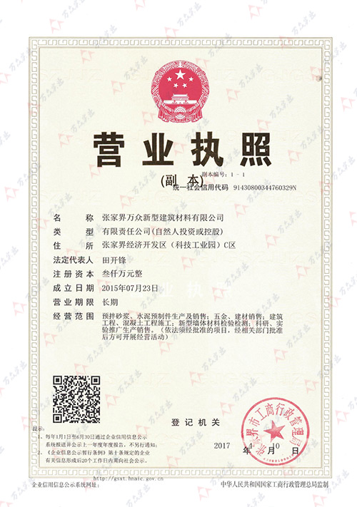 2017-2018 © Copyright. All Rights Reserved 張家界萬眾新型建筑材料有限公司 版權(quán)所有 營(yíng)業(yè)執(zhí)照查詢 湘ICP備17022854號(hào)-1
